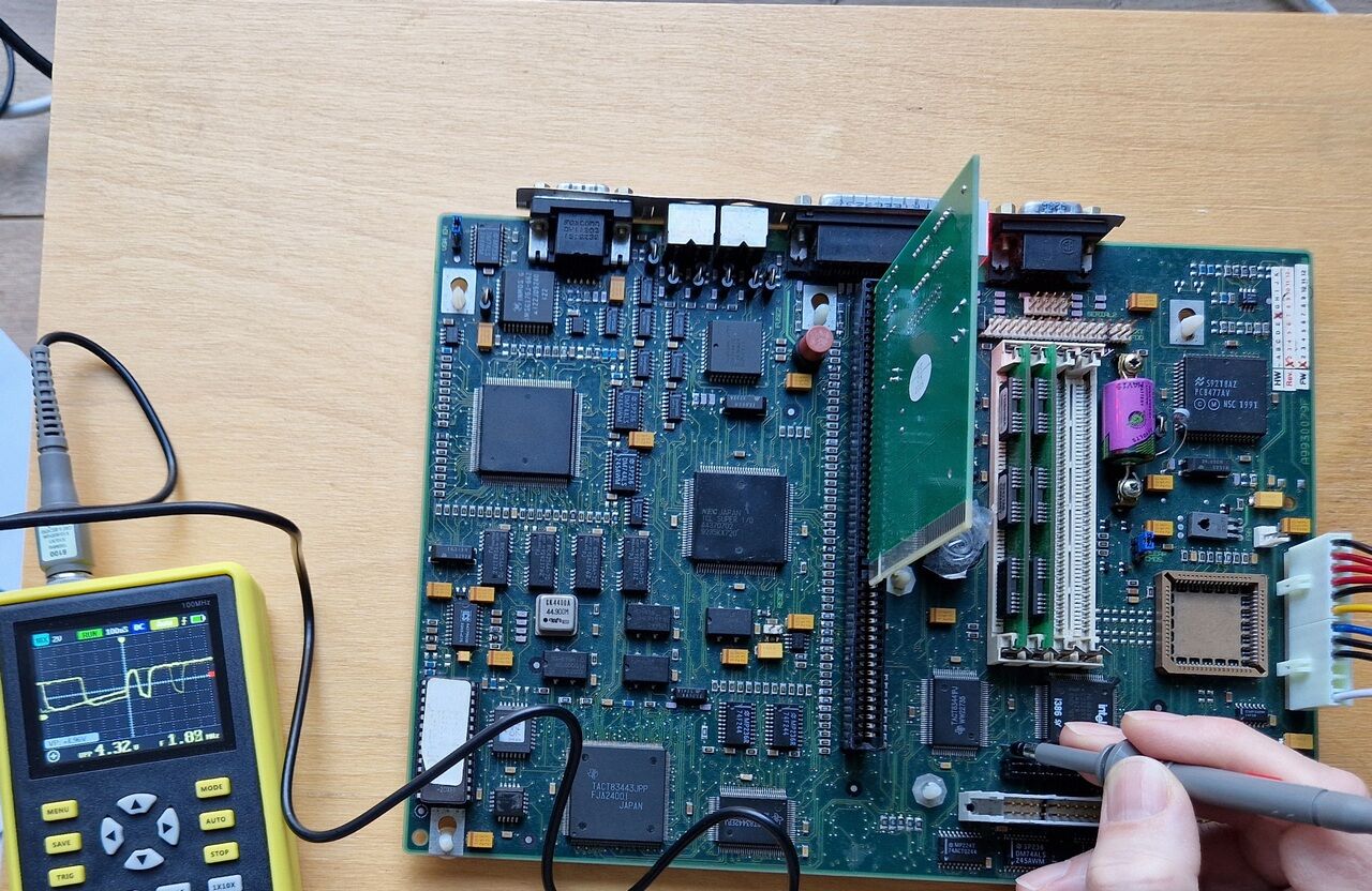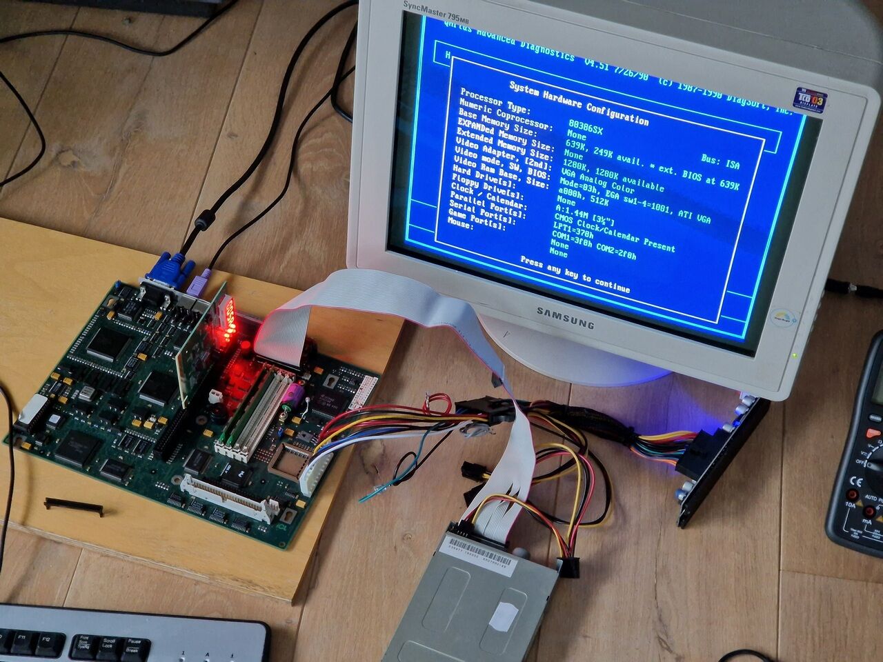 Első ránézésre nincs itt semmi probléma, ez bizony gyorsan üzemben lesz. A tápja egyedi, de ez nem gond, már méricskélem is ki az érintkezőket a jól dokumentált ISA-BUS csatlakozóihoz képest, majd átrendezek egy AT-ATX tápcsatlakozó átalakítót, hogy a táp érintkezők a helyükön legyenek.