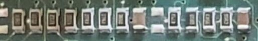 Ennek az eldöntésében a theretroweb kép van segítségünkre, ahol az SMD alkatrész egy másik gyártótól származik, fekete, miközben előbukkan a fehér porcelán széle. Vagyis ez bizony egy festett ellenállás. Ha kondi lenne, nem lenne festés, az egész egy színű lenne, és mint egyfajta mikroszkopikus kupakok lennének a két csatlakozója.
