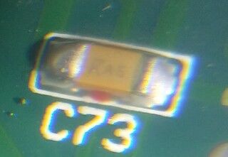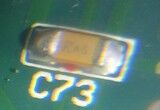 Az SMD kondikat a színe alapján tudom azonosítani. Halvány barna, sötét barna, lilás. A még meglévőket leforraszthattam volna, hogy megmérjem, de végül egyszerűbb volt egy 60x nagyítású, kézi mini mikroszkóp alatt leolvasni az értékeket rejtő halovány kódjaikat.