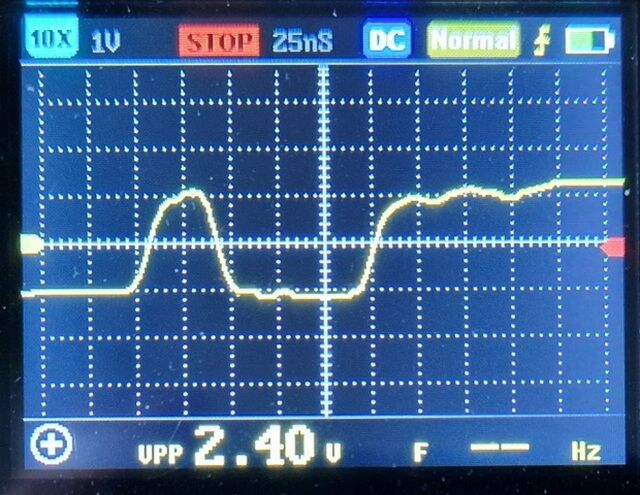 Az órajeleket egy Ali-s digitális oszcilloszkóppal sikerül megmérnem (50 - 60 $-os kategória) Arra jó, hogy lássuk, a szükséges 50 Mhz-es órajel low értéke nagyon magasra kerül, közel 3 Voltra esik. Az Intel a dokumentációjában ezt jóval alacsonyabbra írja.