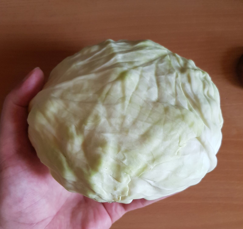 (Igen, ez a káposzta nem a hagyományos gömbölyű, hanem lapos, de ez ilyen fajta. Szerintem jobb az íze és a levelei is vékonyabbak, hamarabb elkészül)