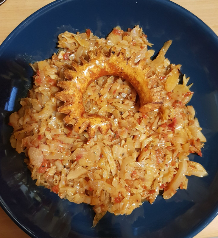 Tudom, hogy ez nem úgy néz ki, mintha kellően paradicsomos lenne, de valójában nagyon jól érződik és a káposzta íze is intenzívebb. Nem tudom, hogy amúgy mennyi idő lenne, de ezzel a módszerrel kb. 20 perc alatt elkészült.