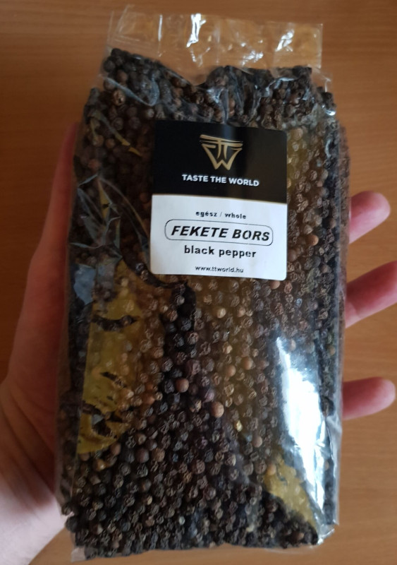 Szóval a feketebors. Mivel sokat használok, a kis kiszerelések nálam nem igazán játszanak és a szokásos helyemen most csak 100 g-os csomag volt, viszonylag drágán. Szóval elmentem máshová, ahol amúgy mindenféle fűszereket veszek és nem féltem megvenni egy vietnámi fekete borsot, mégpedig 500 g, vagyis fél kiló kiszerelésben. Na, hát ilyet még én sem láttam, döbbenetes érzés ennyi borsot kézben fogni.
