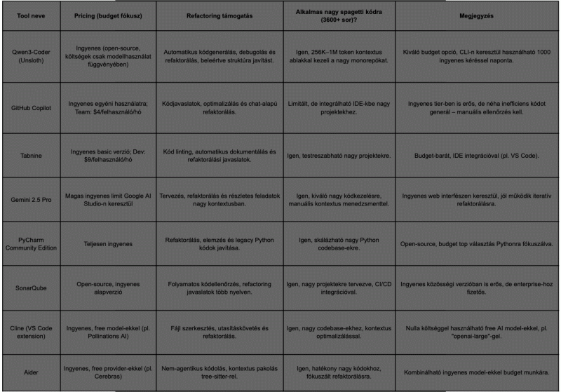 Íme egy összefoglaló táblázat a legjobb budget-barát opciókról, alapul véve a legfrissebb elérhető információkat (2025-ös adatok alapján). Fókuszban az ingyenes/free tier-ek, refactoring támogatás és nagy kódkezelés. Ha lehetséges, linkeltem a tool-okat további infóért.