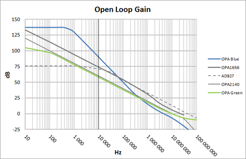Láthatjuk, hogy az egypólusú műveleti erősítők erősítésmenete 20dB/dekád meredekséggel esik. Ebből következően, ha nagyobb erősítést szeretnénk a hangfrekvenciás tartományban, be kell vállalnunk a nagyobb sebességet és az ezzel járó gerjedékenyebb hajlamot. Ezzel szemben a kétpólusú erősítő (az ábrán az OPA Blue az egyetlen ilyen) erősítésmenete meredekséget vált: 40dB/dekáddal indul, majd 20dB/dekáddá szelídül. Ennek azért van jelentősége, mert a stabilitás Nyquist-kritériuma szerint az egységerősítést (0dB-es vonal) 40dB/dekád alatti meredekséggel kell átlépni.