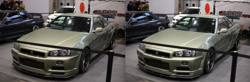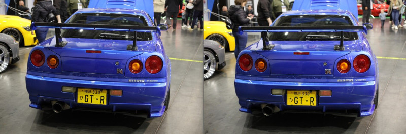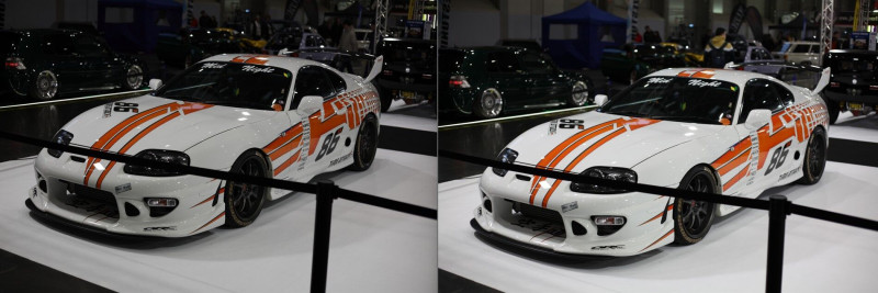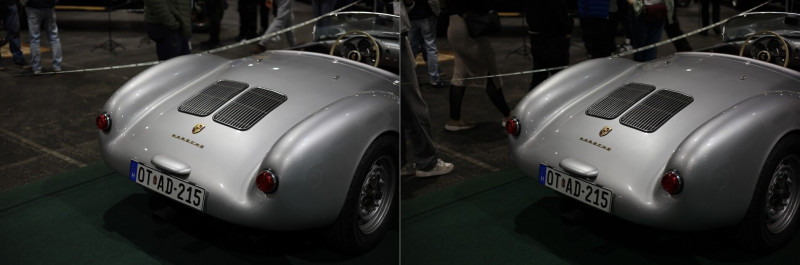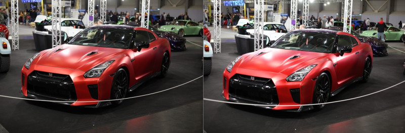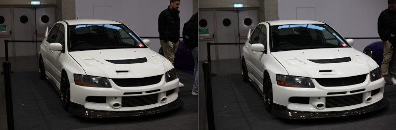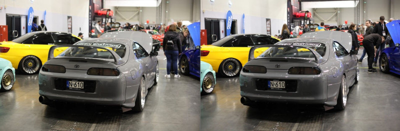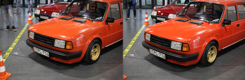 3. Az R6 II-n nagyon agresszív a fénymérése. A Suprás (fehér-narancs) autón látható, hogy mennyire agresszíven lesötétíti. Szinte mintha spot fénymérésre lenne állítva. Az 5D II ugyanazzal a középsúlyos méréssel sokkal közelebb lövi be ahhoz, ahogy a valóságban kinézett.