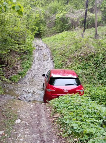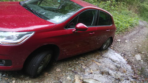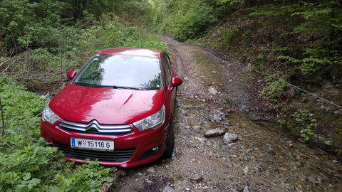 Ez már a Kaán Károly forrás után volt, lefelé baktatva, és néhány 100 méterrel később egy a zöldben jól kirívó nagy pirosságot vettem észre. A dózerutat (mert így hívjuk az ilyen erdei utakat) vagy 3-4 helyen keresztezi a patak, és ez a falu felől nézve a 2. volt. Először azt hittem nem jól látok, de tényleg a jelenleg is gyártásban lévő piros Citroën C4-es állt a patakban. Mint jól látni a képen (W 15116 G) osztrák a rendszáma, és abban a „W” azaz Wien vagy bécsi ha így jobban tetszik. Nagyon oldalt áll, ezért inkább arra tippelek, hogy nem véletlen hanem szándékosan állt félre, elférjenek tőle, ezért jár a piros pont. Mivel tovább nem tudott menni, és (a kép nem adja vissza megfelelően a szituáció mélységét) mennyire meredek oldalon bakkant le, se előre se hátra, csapdába került. Ez egy olyan hely ahol max Toyota Hilux, L200 és társai autókkal ha találkozik az ember, nem hogy egy fronthajtásos utcai gumis kompakttal.