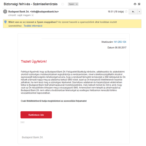 Bár nem vagyok a Budapest Bank ügyfele, de tájékoztattam őket, becsatolva egy screenshot-ot a szóban forgó levélről, hogy valószínűleg adathalászok ügyködnek. A levelet vasárnap kaptam (2017.08.06), azonban az a spam mappában landolt, amit a mobil gmail alkalmazáson nem láttam egyből, így csak másnap vettem észre az üzenetet, amikor böngészőn keresztül beléptem. A Budapest Bank elég hamar reagált a levélre és megköszönte, hogy jelentettem az esetet és innentől beindult a láncreakció, ugyanis a bank főoldalán már figyelmeztették az ügyfeleket ill. több sajtóorgánum is hírbe hozta, mint pl. It café vagy az Index. A piros gomb egy hivatkozás rejtett, amire érthető okokból nem kattintottam. Az URL egyébként ufakurl-es linkre mutatott, ami ugye egy free URL shortening szolgáltatás. A levél után lecsekkoltam az e-mail címemet a haw i been pwned oldalán, de nem adott találatot az e-mail címemre. Nem állok értetlenül az esettel kapcsolatban, hiszen egyre több ilyet hallani. Az pedig pozitív, hogy ilyen gyorsan reagáltak a dologra, hiszen nagyon sok naív ember van, akiknek nem elégszer kell ismételni...