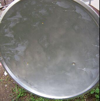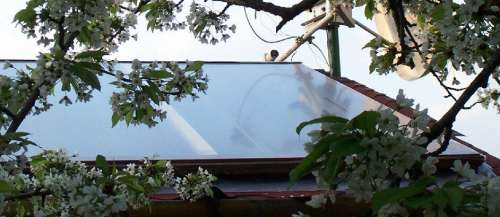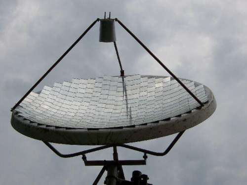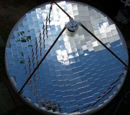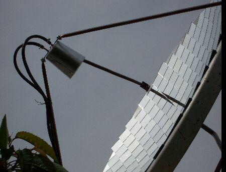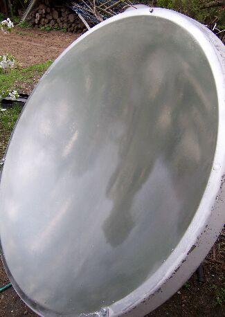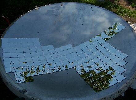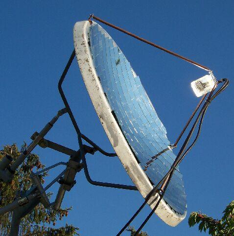 Van pár régi nagy parabola antennám. Ezekből egynek a felületét megcsiszolom és festék segítségével gyakorlatilag egy homorú tükröt készítek. (Rázós egy feladat.) A parabola fókuszpontjába egy fekete tartályt teszek, amit egy befőttes üveg fog védeni a szellőcskék hűtő hatásától („üvegházhatás”). Elvileg egy akár 1kW teljesítmény (energia) is érkezik a napból a földre négyzetméterenként. Nekem kb. másfél négyzetméter felületű az antennám.