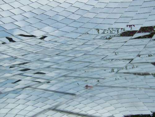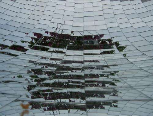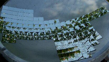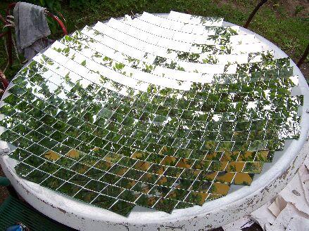 A képen egy cseresznye fa ára tükröződik a lapocskákon. Ekkor már tudtam, hogy nem is olyan rossz ötlet kirakni a parabola belső részét ilyen lapokkal.