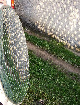 Ezeknek a fókuszpontja nem a tányér előtt van, hanem lejjebb. Így a melegítendő tárgy nem takar ki (árnyékol) hasznos felületből. A fókuszpontba egy befőttes üveget tettem a befőttes üvegbe pedig egy feketére festett kólás dobozt, amiben kb. 3 dl csapvizet töltöttem.