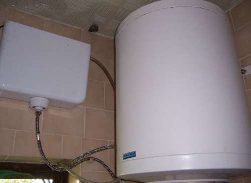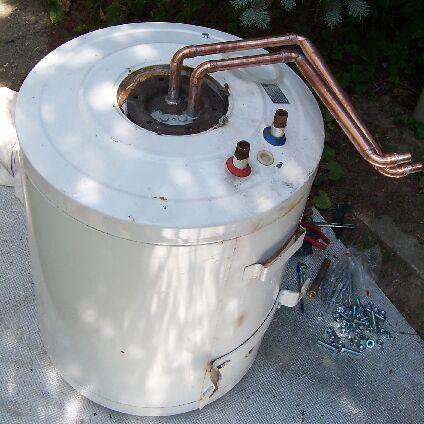 Van két 80 literes Hajdu bojlerem. A képen a felső szolgáltatja a fürdéshez a meleg vizet. Eredetileg elektromosan fűtött, kb. 1.2kW-os fűtőbetét van benne és 5.5 óra alatt fűti fel a csapvizet 80 fok környékére.