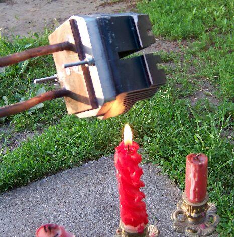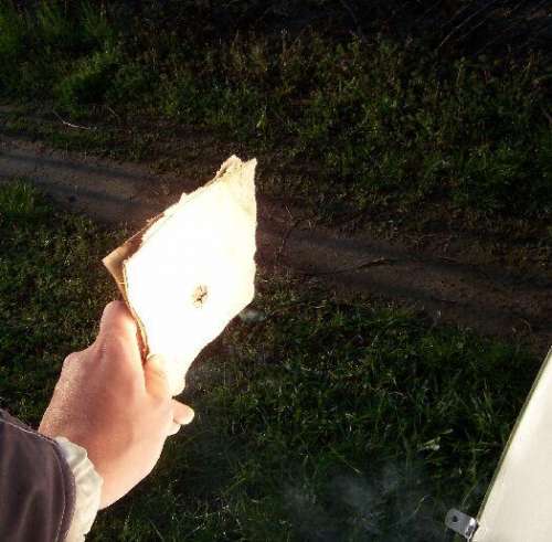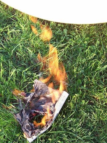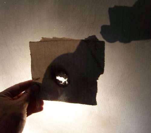 Kezdetben egy digitális hőmérő érzékelőjét tettem a fókuszpontba, de a fekete kábele szinte azonnal lángra lobbant és ezzel együtt egy error felirat jelent meg a kijelzőn. Így papírdarabokkal kísérleteztem. Kb. 5 másodperc alatt kilyukaszt egy vastag karton papírt az az energia, ami a fókuszpontba koncentrálódik, íme: