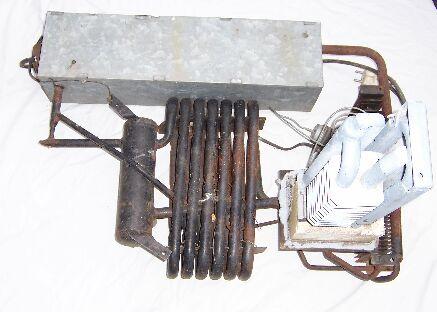 Ez egy négycsillagos Elektrolux abszorpciós hűtőgép a hűtőház nélkül. A baloldalon látható bádog lemezzel bevont részben sok hőszigetelő anyag és egy elektromos fűtőbetét van. A meleg hatására a benne lévő ammónia nagy nyomást hoz létre. Mielőtt egy vékony csövön porlasztaná a rendszer ezt a nagy nyomású ammóniát egy rövid szakaszon visszahűtik. Így végül is folyadék-gáz halmazállapot változás megy végbe a porlasztás során, ami komoly hőelvonással jár. Bő 100Watt felett fogyaszt ez a hűtőgép, de ha lesz napenergiával fűtött meleg vizem, akkor nem lesz szükség a fűtőbetétre, azt közvetlenül meleg vízzel is fűthetem.