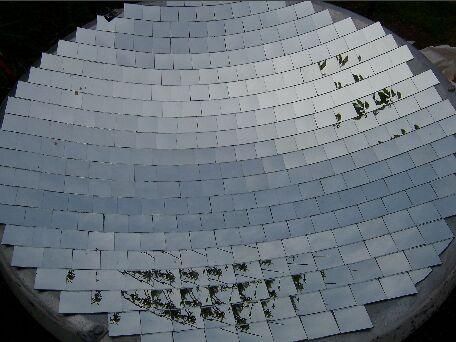 A parabola felülete 1.13 négyzetméter (120cm átmérőjű), úgy számolom, hogy a tükrök illesztése során kb. 3% felületet veszítettem, tehát a tükrös felület 1.1 négyzetméter körül van.