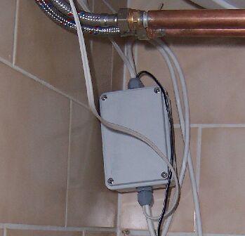 Hőmérséklet érzékelőket is tettem a bojlerbe, erről még szó lesz. A hőmérséklet érzékelő kábele az a fekete lelógó vezeték.