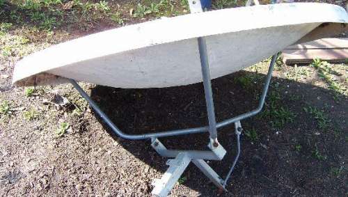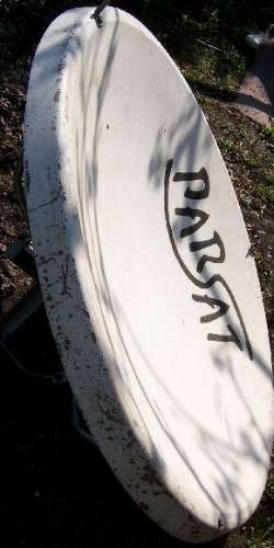 Ez a parabola üvegszál erősítésű műanyagból van és legalább 10éves darab, a felületén rengeteg hibával.
