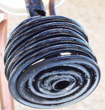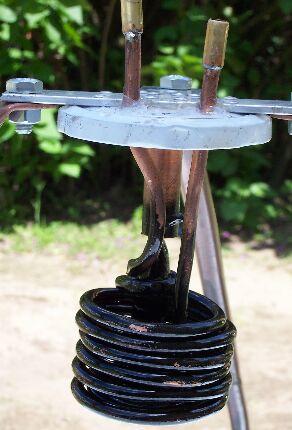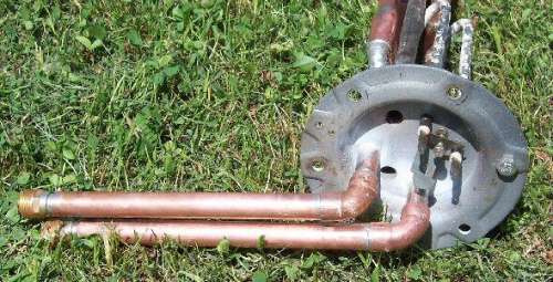 Az alábbi képen azt a fűtő betétet láthatjuk, mely a bojler vizét melegíti majd. Ennél nincs elektromos fűtés, csak a kollektorból jövő forró víz áramlik át a képen látható rézcsöveken. A rézcsöveket a bojlerben lévő víz veszi körül, vagyis fel fog melegedni a 80 liter víz: