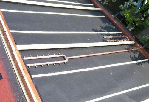 A tető egyik felét megint csak 1 nap alatt sikerült becsövezni. Összesen 224 méter csövet sikerült így beépítenem. Nagyon nagy munka volt ezt a sok csövet közel rendezetten végigvezetni, már csak azért is, mert a fekete részre nem lehet ráállni, ezért akrobatikusan mindig a fa kereten kellett tartózkodnom. Arról még nem is szóltam, hogy milyen érzés, amikor a 65 fokra felmelegedett kátránypapíron kell szerelni...