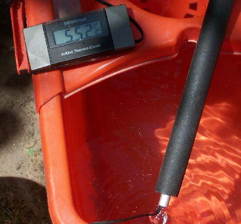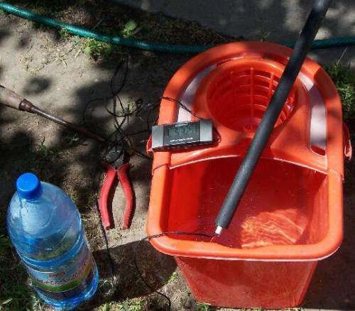 Természetesen ki is próbáltam, kb. délután kettőkor, rákötöttem a rendszert a kerti csapra és megnyitottam. Úgy állítottam be, hogy egy 50 literes műanyag edény pont öt perc alatt teljen meg. Ez kb. annak felel meg, mint amikor valaki a kertben locsol. Miután átmostam a rendszert, és kiengedtem a kezdeti hatvan fokos folyadékot nekiestem a mérésnek. Pont 10 fokos volt a csapvíz hőmérséklete. Az edény öt perc alatt 28 fokos vízzel lett tele.