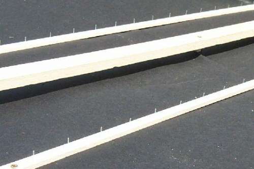 Említettem, hogy a vas, réz, alumínium drága dolog, pláne ha sok kell, akkor érzi meg csak igazán az ember pénztárcája. Ezért én fekete gumicsövet vettem. Ezt raktam fel csőkígyóként a kátránypapírra. Node, így a csövek lecsúsznának, ezért 14db 2 méteres vékony fapálcát tettem a kátránypapírra, amibe összesen kb. 600db szöget vertem be. No ez húzós meló volt.
