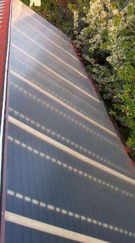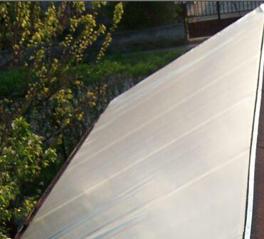 A hatások javítása érdekében befóliáztam az egészet. Az üvegről és az átlátszó polikarbonát vagy plexi lapról azt tudnám elmondani, mint a rézről vagy alumíniumról, vagyis drága. A fólia olcsó és szerintem még akkor is megéri, ha évente cserélni kell, mert 20 négyzetméter fólia nem egészen kétezer forint volt, ehhez képest pl. a plexinek tízezer az üvegnek nyolcezer forint körül van négyzetmétere. Tehát a fóliának kb. 100Ft négyzetmétere, ami elég barátságosnak mondható és könnyen kezelhető.