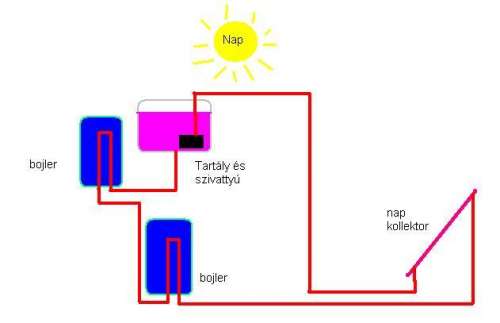 A napkollektor és a bojlerek között vagy 8 méter távolság van, így hőszigetelt csövekben juttatom el a folyadékot kollektorból a bojlerbe épített hőcserélőbe.