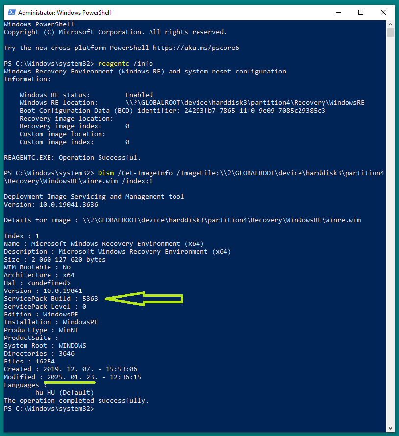 reagentc /info Ellenőrizzük hogy oda került-eDism /Get-ImageInfo /ImageFile:\\?\GLOBALROOT\device\harddisk0\partition4\Recovery\WindowsRE\winre.wim /index:1