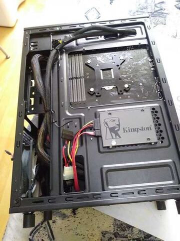 A hirdetés leírása alapján ezt a házat vízhűtés fogadására is készítették. Ebből a tervezés szintjén annyi valósult meg, hogy a hátlapon van két perforált karika (minek?) meg az alaplap felett van akkora hely, ahova befér a vízhűtő.