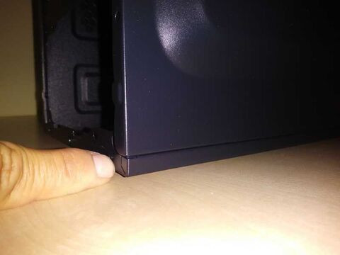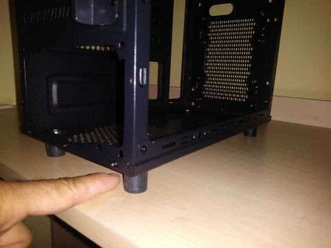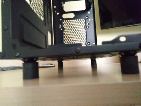 A második döbbenet az alján ért. Az asztalra téve a ház alja és a talaj között 5mm a rés. Ez ugye egy alsótápos kialakítású ház, a táp pont ezen az 5 miliméteres résen keresztül kellene hogy levegőt kapjon a “hatékony” hűtéshez. Hogyan? Ez még viccnek is rossz.![]()