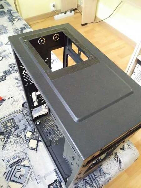 A tetejére rájelöltem a vízhűtő felfogatását, majd kifúrtam és kivágtam a helyét. Az éleket leragasztottam. Az aljába négy gumi szilent került, furatok után becsavarozva.![]()
