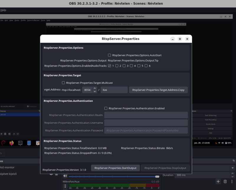 A RTSP stream sokkal érdekesebb. Ehhez kell az obs-rtspserver plugin, ami csomagból települ, bár nekem még kellett kézzel mókolni (a csomagból a .so file -t a /home/user/.config/obs-studio/plugins/obs-rtspserver/bin/64bit könyvtárba másolni). Nyilván a RTSP szerver nem kimeneti opció lesz, hanem a Tools menüben fog megjelenni.