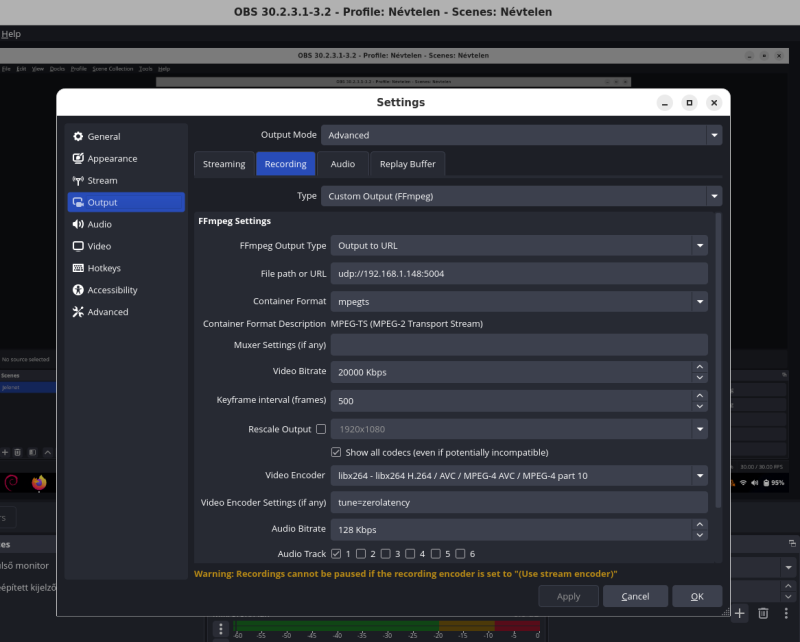 Már amennyire ez az. Tehát letettem a Pi-re scriptet az UDP és RTSP vevőkre, így ssh raspberrypi "sh vlc_rtsp_sajatgepem.sh" -val indul a RTSP vétel, ha már megnyomtam az OBS-ben a startot. UDP ugyanígy.