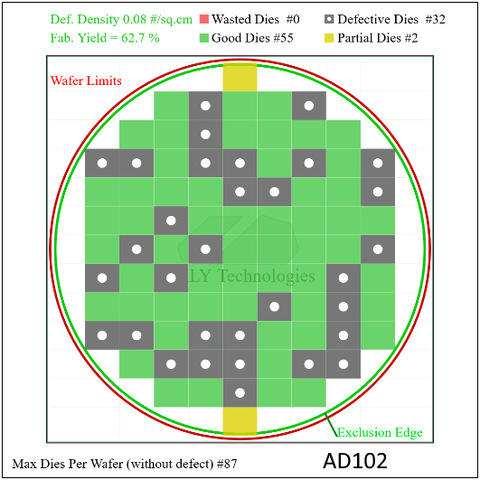 AD102: 55 / 87 hibátlan chip (62.7% yield), 32 defektív chip