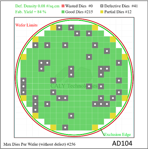 AD104: 215 / 256 hibátlan chip (84% yield), 41 defektív chip