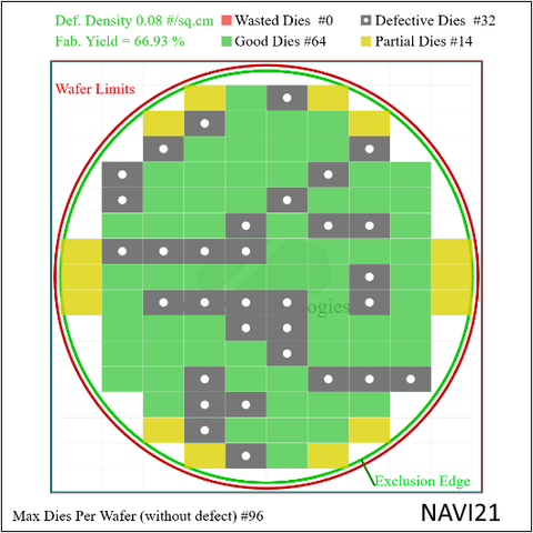 Nav21: 64 / 96 hibátlan chip (67% yield), 32 defektív chip