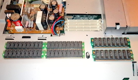Az STe már szerencsére sima 9 bites SIMM modulokat használ. Az eredeti két 256kB-os modult (jobb oldali kettő) cseréltem 4x 1MB-ra (bal oldali négy). A felső borítás után a billentyűzetet szépen kihajtottam jobb oldalra, ahogy a kábel engedte. Már csak a tápot és memóriát takaró árnyékolást kellett levennem a cseréhez.
