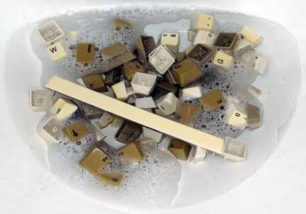 Jött a mosás. Fehérítés kimaradt ismét. A billentyűkre pedig ráfért volna, a képen láthatjátok is, hogy miért. Érdekes, hogy nem egyenletesen sárgult, hanem a használatnak hála még meg is kopott a sárgulás például a space-en. A ház nem borzalmasan sárga, még csak patinás.