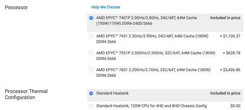 Intel oldalon tegyük fel, hogy 2x Xeon 4116 hajtja a DL360 Gen10 vagy R640 gépeket. Mivel a többi komponens nem változna, ezért erre keresem az alternatívát. A legjobb egy EPYC 7402P lenne sima egyutas konfigurációban. Lássuk a két gyártót: