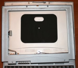 Négy csavar tartotja a keretet és körben ki kell pattintani a füleket. Full műanyag, mégis ez az öreg laptop jobban össze volt rakva, mint a mai új darabok. Az LCD-t hátulról egy fekete gumírozott lap támasztja és még négy csavar tartotja stabilan a helyén. Két csatlakozó széthúzása után már a kezemben volt a panel.