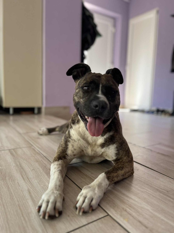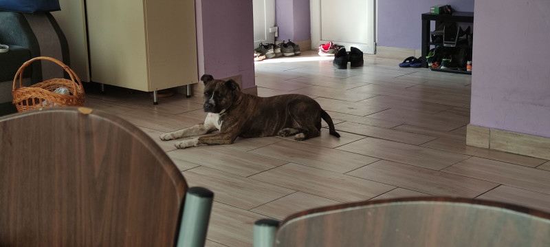 -nem domináns, valószínűleg kijönne más kutyával is, de jelenleg csak ő van (így kérdéses, hogy kettesben vagy a saját területén hogyan viselkedne)
