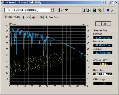 a gépemben volt egy sima 160 gigás vinyó, de vmi eszetlen lassú volt, amit az első ábra mutat. 40-20 MB/sec közötti olvasás/írás tempóval, majdnem olyan lassú mint egy pendrive... Pedig új korában hasított, legalábbis ez rémlik.