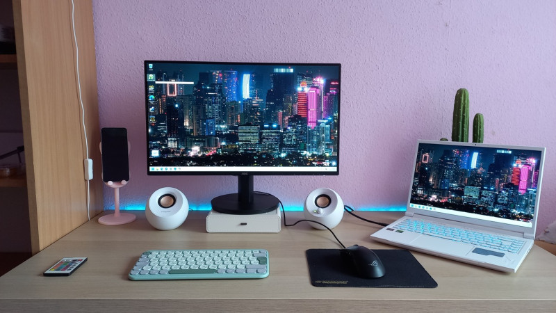 Asus KW 100 Bt billentyűzet, ROG Gladius II Core egér, Creative Pebble V1 hangszórók, led szalag és Samsung ZFlip 7FE