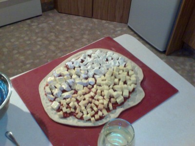 Az alapot megkentem Leggo's féle jófajta paradicsomos alappal, négy részre osztottam, és elkezdtem felhalmozni a sajtot. Feta, brie, aztán a hűtő sarkában talált kb 10 dkg füstölt cheddar kockázva, végül egy kis kockázott Edami sajt. Pont kész lettem vele mire a tenger gyümölcsei pizza megsült.