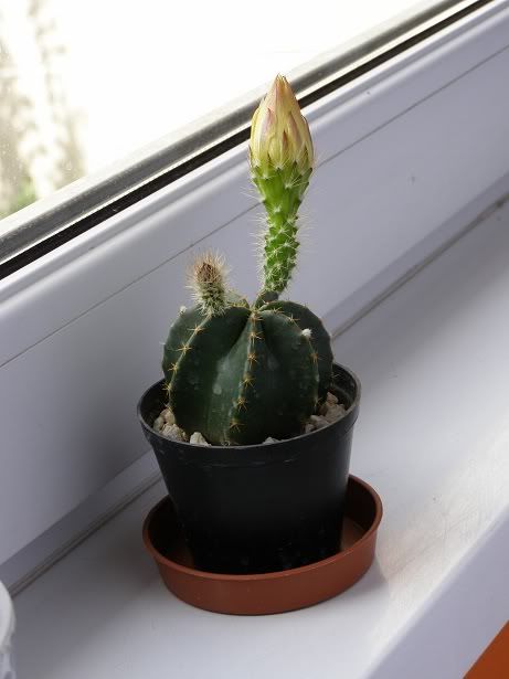 Körülbelül egy hete kaptam egy kaktuszt, amire szintén ezt mondták, hogy virágozni fog 1 héten belül. De most kivételesen hét közben tényleg úgy tűnt, hogy így is lesz. Ma eljött a nagy nap: gondoltam egyet, bekészítettem délelőtt a fényképezőmet az állványon, hogy megörökítse ezt a kivételes eseményt.