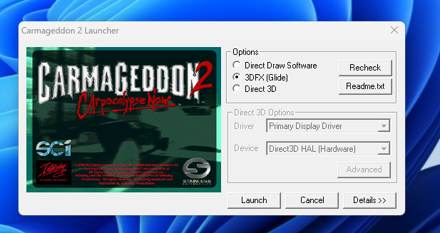 Szóval marad a carmageddon 2. Egy korai verzió kézzel patchelve. Eredetileg hibát írt ki hogy Windows NT nem támogatott. Hát igen amikor az a játék készült akkor bizony még XP sem volt.