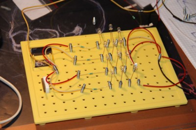 Amikor kiszedtük a harisnyából a ledeket egy kettő eltört de megforrasztottuk vagy másikat forrasztottunk a helyére. Nagyon ideg őrlő munka. Kb este 8tól hajnali 3 is dolgoztunk. ekkor volt 2 db működő sor a másik kettő meg valahol eltört. Másnap reggel 10kor neki áltunk ismét minednt megcsináltunk egy kapcsolót is forrasztottunk az áram körbe. De egy led se moccan. Jött a haj tépős időszak amikor probáltuk kideríteni mi a hiba. 2 sort sikerült megjavítani ez így 6db led. Amivel még délután 5ig bibelödtünk. de végül kész lett. agyon büszkék voltunk.