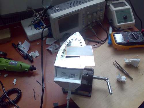 Hint: Mellette ott van a prototípus, ami működik is, csupán elfelejtettem, hogy a tükörkép nyomtatásnál nem csak a műveleti erősítő IC lábai fognak fordulni, hanem az erősítő tranyóké is. Így a 2. ennyivel különbözik, de az elkészítéskor sok hasznát vettem az elsőnek is, mintaként. Nem beszélve arról, hogy a második az Istenért sem akart menni. Összehasonlító kiméréssel rájöttem, hogy egy (még nagyítóval is csak) alig látható részen rövidre volt zárva a mart nyák. Kb 4 órám este, majd újabb 2 órám reggel elment a hibakereséssel. Az idegi állapotomat nem szeretném megosztani veletek
