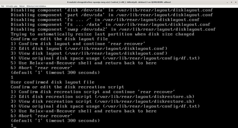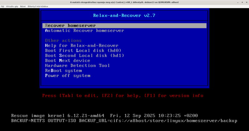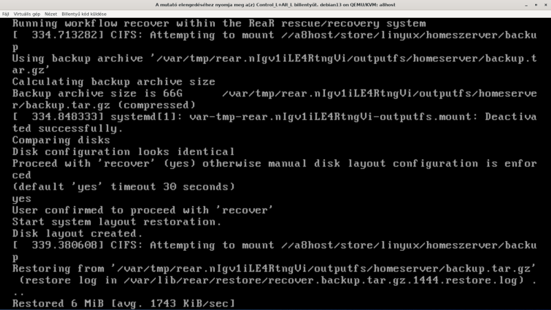 A backup (ha nem kell ISO, mert már van, akkor rear -v mkbackuponly ) :root@homeserver:~# /usr/sbin/rear -v mkbackupRelax-and-Recover 2.7 / GitRunning rear mkbackup (PID 4062403 date 2025-09-12 10:20:20)Using log file: /var/log/rear/rear-homeserver.logRunning workflow mkbackup on the normal/original systemUsing backup archive '/var/tmp/rear.KAqDBJCxsWpZSUE/outputfs/homeserver/backup.tar.gz'Using autodetected kernel '/boot/vmlinuz-6.12.21-amd64' as kernel in the recovery systemCreating disk layoutOverwriting existing disk layout file /var/lib/rear/layout/disklayout.confUsing guessed bootloader 'GRUB' for 'rear recover' (found in first bytes on /dev/sda)Verifying that the entries in /var/lib/rear/layout/disklayout.conf are correctCreated disk layout (check the results in /var/lib/rear/layout/disklayout.conf)Creating recovery system root filesystem skeleton layoutTo log into the recovery system via ssh set up /root/.ssh/authorized_keys or specify SSH_ROOT_PASSWORDCopying logfile /var/log/rear/rear-homeserver.log into initramfs as '/tmp/rear-homeserver-partial-2025-09-12T10:20:29+02:00.log'Copying files and directoriesCopying binaries and librariesCopying all kernel modules in /lib/modules/6.12.21-amd64 (MODULES contains 'all_modules')Copying all files in /lib*/firmware/Symlink '/usr/share/misc/magic' -> '/usr/share/file/magic' refers to a non-existing directory on the recovery system.It will not be copied by default. You can include '/usr/share/file/magic' via the 'COPY_AS_IS' configuration variable.Testing that the recovery system in /var/tmp/rear.KAqDBJCxsWpZSUE/rootfs contains a usable system/usr/lib/x86_64-linux-gnu/systemd/libsystemd-core-258.so requires additional librarieslibsystemd-shared-258.so => not foundReaR recovery system in '/var/tmp/rear.KAqDBJCxsWpZSUE/rootfs' needs additional libraries, check /var/log/rear/rear-homeserver.log for detailsCreating recovery/rescue system initramfs/initrd initrd.cgz with gzip default compressionCreated initrd.cgz with gzip default compression (376121535 bytes) in 98 secondsMaking ISO imageWrote ISO image: /var/lib/rear/output/rear-homeserver.iso (372M)Copying resulting files to rsync locationSaving /var/log/rear/rear-homeserver.log as rear-homeserver.log to rsync locationCopying result files '/var/lib/rear/output/rear-homeserver.iso /var/tmp/rear.KAqDBJCxsWpZSUE/tmp/VERSION /var/tmp/rear.KAqDBJCxsWpZSUE/tmp/README /var/tmp/rear.KAqDBJCxsWpZSUE/tmp/rear-homeserver.log' to rsync locationbackup@a8host's password:Making backup (using backup method NETFS)Creating tar archive '/var/tmp/rear.KAqDBJCxsWpZSUE/outputfs/homeserver/backup.tar.gz'Archived 67244 MiB [avg 6580 KiB/sec] OKArchived 67244 MiB in 10465 seconds [avg 6579 KiB/sec]Exiting rear mkbackup (PID 4062403) and its descendant processes ...Running exit tasksroot@homeserver:~#