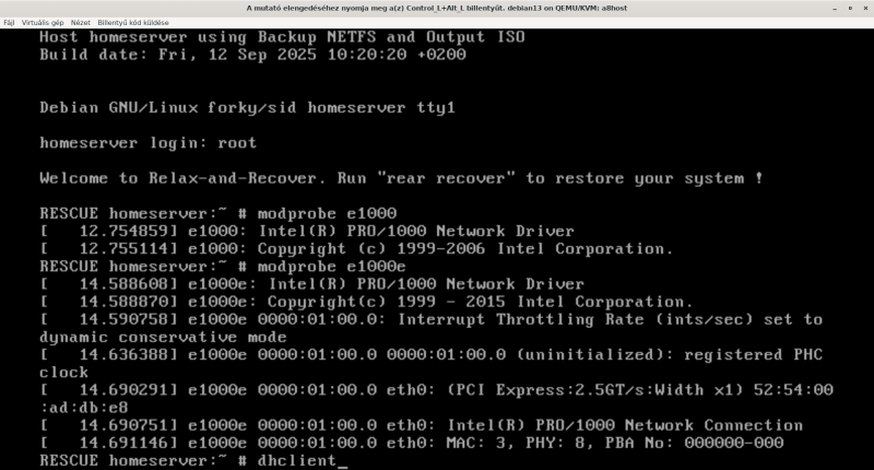 Itt volt valami bug, mert ugyan nem ugyanolyan gépre tettem vissza a backupot, mint amiről mentettem, de ugyanolyan hálókártya volt benne. A home szerveremben az Intel e1000e modul kezeli a hálózati kártyát, és a visszaállítás tesztelésére használt virtuális gépbe is ugyanilyen kártya került, mégsem ismerte fel a Rear ISO.
